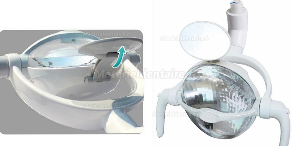 La conception de capot pour prévenir la poussière et la impureté, aussi, il protégé bien le réflecteur.La conception brevetée, ajouter le miroir plan dans le haut du lampe qui est pratique pour le communication du patient et du médecin avant et après la chirurgie.