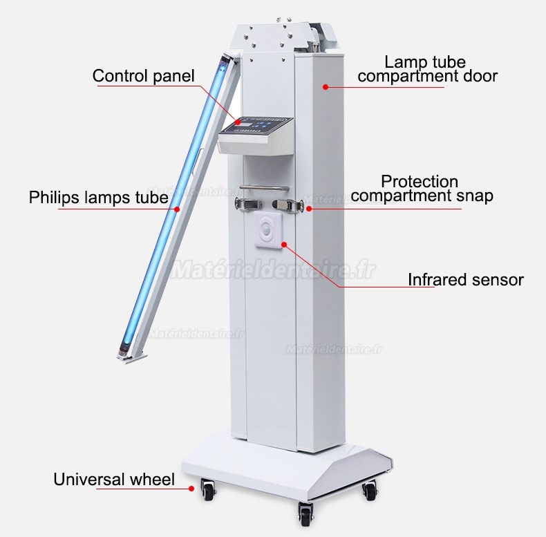 Stérilisateur de lumière UVC, dispose de quatre (4) lampes UV germicides de 30 watts / 55 watts qui émettent une lumièreUV de haute intensité qui frappe toutes les surfaces de la pièce et tue tous les micro-organismes ou agents pathogènes, y compris le SARM, la fièvre aphteuse, le rhume et la grippe, pneumonie, moisissures, e.coli, salmonelles et bactéries de type similaire.