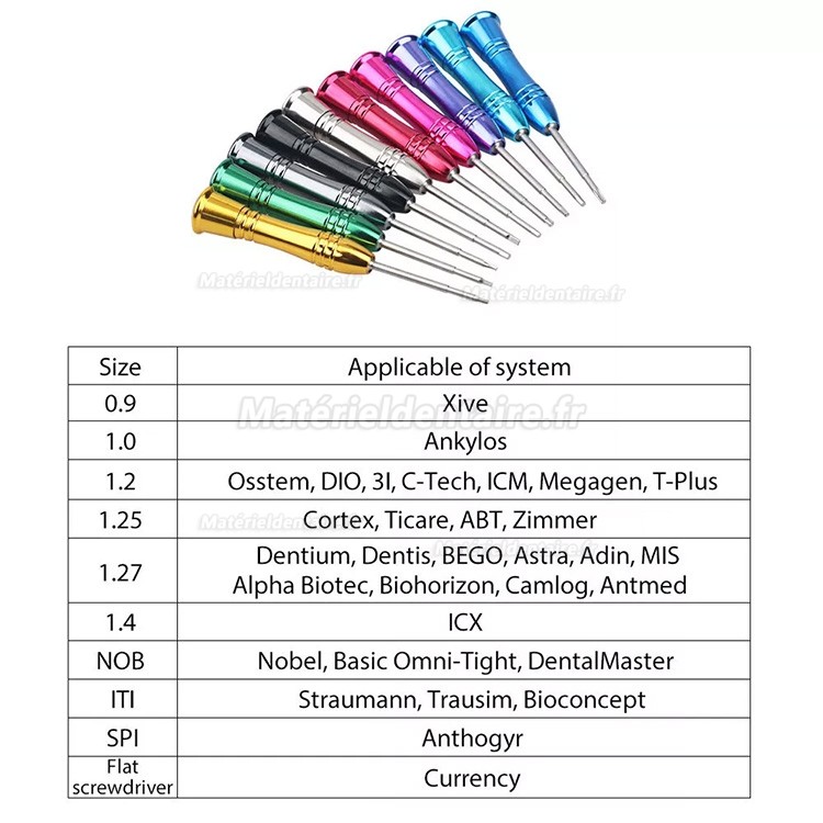 - 10 tournevis en acier spécial trempé, durables et compatibles avec différents types d'implants.